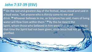 John 7:37-39 (ESV) 37 On the last and greatest day of the festival, Jesus  stood and said in a loud voice, “Let anyone who is thirsty come to me and  drink.”